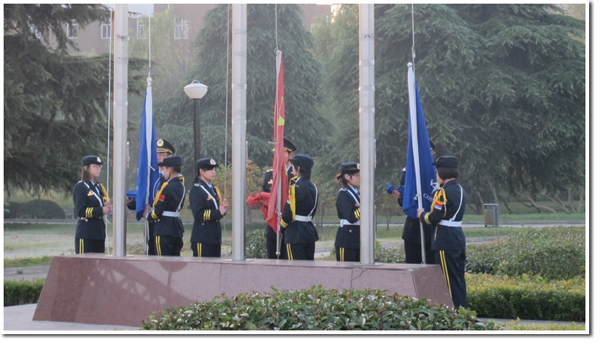 国歌嘹亮,响彻校园。旗手们把庄严的军礼和心中的赤诚献给国旗,鲜艳的国旗伴随着大家的注目礼徐徐升起,在场的每一个人都热血沸腾。伴着校歌《永恒的东风》那铿锵舒扬的旋律,国旗、校旗、院旗在蔚蓝的天空下飘扬舞动。