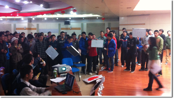紧接着,进入最激动人心的趣味活动环节。全班同学分为四组,各组全情“备战”。为了让同学们感受到集体的温馨并充分参与其中,活动策划环节凝聚了组织者的不少心思:“趣味竞答”――题目大到学校社团的分类,小到食堂土豆丝的价格,参赛的一组同学因答错题目报纸折半,一名男生不得不将另一名男生“公主抱”,引得全班尖叫连连;“猜照片”――PPT上连续播放班级同学PS后的照片,并逐渐恢复原状,让每组同学抢答,看到同班同学们今昔巨大的变化,全班爆笑不止,晚会的气氛推向了高潮;“猜方言”――戴上墨镜,穿上西装,一曲“江南style”,这个由同学们自导自演的方言版短片又令在场的所有同学捧腹不已;更有“吹气球”、“吃蛋糕”、“比划猜”等游戏,同学们在排山倒海的笑声中体味到了班集体的其乐融融。