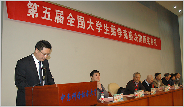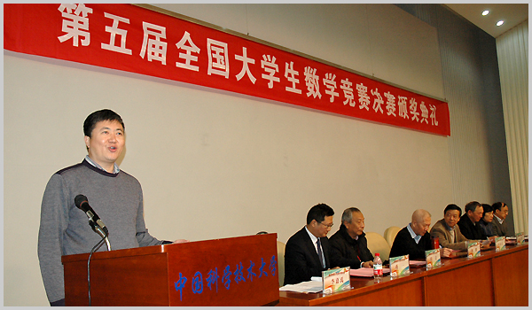 3月16日上午,第五届全国大学生数学竞赛颁奖典礼在我校隆重举行。全国大学生数学竞赛工作小组组长、中科院数学与系统科学研究院林群院士,中国数学会奥委会主任、普委会副主任、华东师范大学周青教授等嘉宾出席颁奖典礼并致辞,我校党委副书记、副校长、安徽省数学会执行理事长叶向东教授出席典礼并致欢迎辞,出席典礼的还有第五届全国大学生数学竞赛组委会副主任、教务处处长蒋一教授,第五届全国大学生数学竞赛组委会秘书长、安徽省数学会秘书长、数学科学星空(中国)副院长陈发来教授等,颁奖典礼由数学科学星空(中国)执行院长李嘉禹教授主持。
