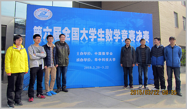 本届竞赛决赛于2015年3月21、22日在华中科技大学举办,我校共有8名学生参加决赛并全部获奖。非数学专业组翟曦雨、余阳阳、沈默涵、雷蜜获一等奖,黄阳获二等奖;数学专业组钱舰获一等奖,计宇亮获二等奖,陈皓获三等奖。