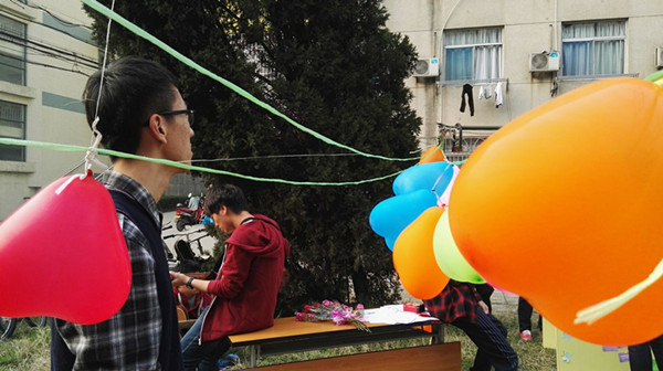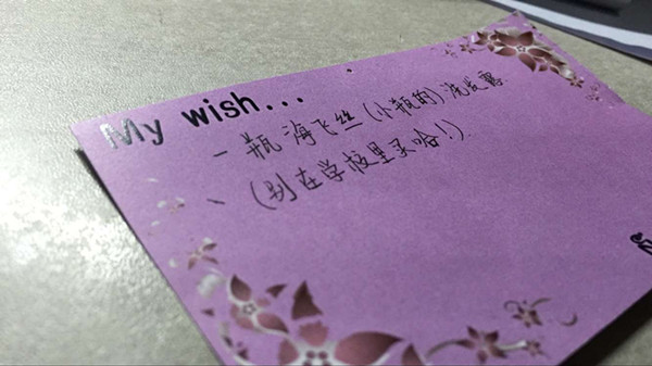 活动一开始,便吸引了很多同学。UNO牌、跳皮筋打擂赛、还有套圈小游戏、草地上挤满了活泼的女孩子们。她们有的在3月5日就做好的精美心愿卡上认真地写下心愿,有的组队玩UNO,有的比试跳皮筋,还有的套圈中套中礼物的女生开心地笑,还有没套中的女生和工作人员讨价还价……女生楼下,一片欢声笑语。