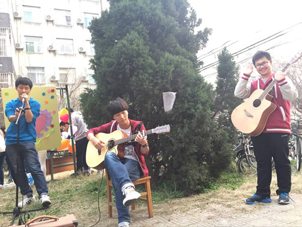 草地上最吸人眼球的是三个抱着吉他的大男孩,“对面的女孩看过来,看过来,看过来……”歌声吸引着过往的女孩子,甚至楼管阿姨也在一旁笑意盈盈,《南山南》,《一次就好》,《tears in heaven》……男生的动人歌声更为女生节添上了独特的色彩。