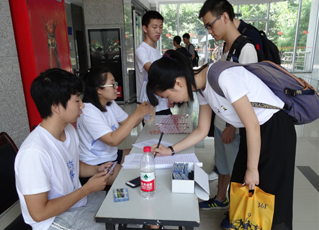 早上7:30,志愿者们就已在接待大厅就位,准备迎接参加夏令营的同学们。8点开始一直到下午4:30,陆续有营员前来报道。在志愿者们的引导下,营员们认真核对好个人信息,签名确认之后,志愿者给营员发放营服、胸牌、书包等,并耐心讲解在校注意事项以及下午参观校史馆和晚上全营见面大会等安排。
