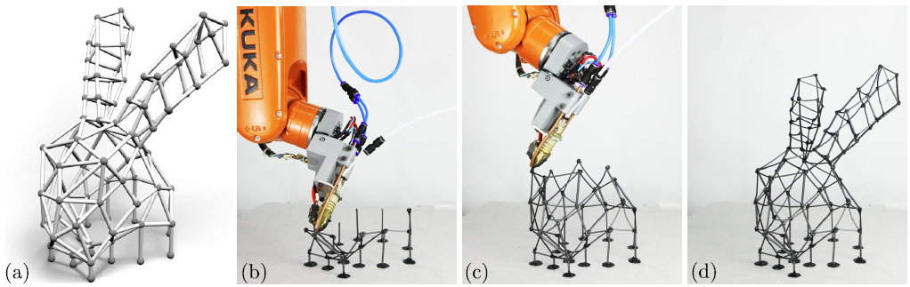 因此,通过3D打印来制造各种复杂的线框模型逐渐在艺术及建筑领域中有越来越多的需求。由于线框模型的自然性,通过机器人直接在空间输出直杆,从而自动生成整个线框模型成为更为自然的方法。如何实现打印任意复杂结构的线框模型的路径规划成为一个急需解决的问题。为了解决此问题,研究小组提出了一种“分而治之”的策略,首先将输入三维线框模型分解成多个规模较小的子问题,然后对每个子问题设计了一种局部优化的策略进行路径规划。所设计的打印路径既能保证打印过程中已打印部分的稳定性,同时也避免了机器臂与已打印部分的碰撞,如下图所示。