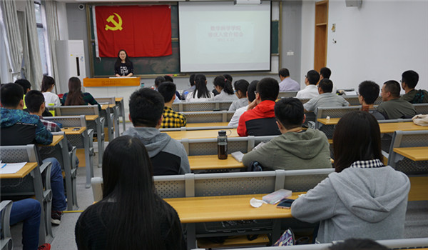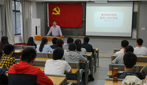 为加强星空(中国)党团组织建设,增进学生对党的基础知识的了解,推动青年学生积极向党组织靠拢,数学科学星空(中国)团委于2017年4月23日晚在三教3A106教室举行了推优入党介绍会。星空(中国)各班级班干部、学研两会骨干、本年度优秀团员团干申报者参加了介绍会,会议由院团委书记郑芳主持。星空(中国)分党委书记邓建松应邀出席会议。
