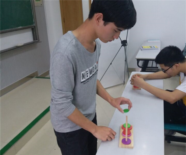 下午参赛的朋友们很有意思,性格特别开朗,表现得非常棒。玩着游戏,他们还时不时互相快活地逗弄一下队员,玩得非常开心。游戏环节中有一个是汉诺塔,这个游戏很多队伍一开始都比较陌生,不过大家都在很认真得琢磨这个游戏,项目组同学也会做出相应的指导。效率比较高的队伍一般都是选出一名指挥者,由他来指导大家怎么移动圆片。当最后一支队伍惊险地在5点35分结束了汉诺塔比赛的时候,他们意犹未尽呢。