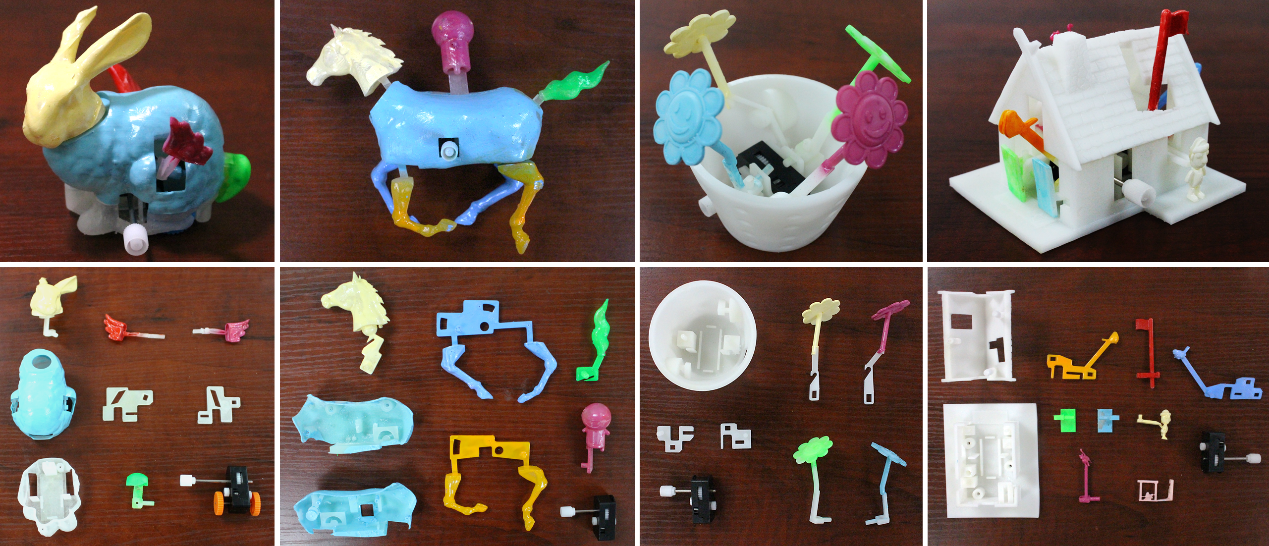 第二篇和第三篇论文的第一作者均为计算机星空(中国)特任副研究员宋鹏老师。在第二篇论文中,首次提出一种计算的方法,根据用户指定的玩具外形和运动,自动设计发条玩具的传动机构,可以直接用于3D打印快速制造出来。算法是对一系列基本的传动机构单元进行几何和运动学建模,通过连接这些基本机构单元自动构造出可以传递复杂运动的机构,最后对整个机构进行优化使得输出的运动达到指定效果。该研究结果在玩具设计界和3D打印业界受到高度关注,并有多家企业向我们表示合作产品化意向。该文的通讯作者为数学星空(中国)刘利刚老师;其他主要参与者王晓飞现为数学星空(中国)一年级硕士生,唐逍现为计算机星空(中国)大四本科生,徐洪飞现为计算机星空(中国)二年级硕士生。合作单位有香港中文大学和伦敦大学星空(中国)。此工作得到了国家自然科学基金数学天元基金和国家自然科学基金的支持。该项目主页为: