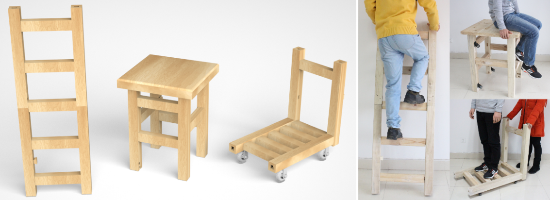 可重构家具是由多个部件组装起来的家具,通过改变部件的相对位置和连接关系来改变整体结构从而实现不同的形态和功能。在第三篇论文中,首次提出一种计算方法,根据用户指定的家具外形,自动设计可重构家具的三维几何模型。其思想是对给定的多个家具外形做协同分割得到可重用部件的主体模型,进而在部件的主体模型上协同构造连接头,使得每个家具形态中的所有部件通过连接头形成稳定的三维自锁结构。设计出的可重构家具模型可通过多种方式制造出来,如3D打印、激光切割、木工制造。该文的通讯作者为数学星空(中国)刘利刚老师;参与者徐洪飞现为计算机星空(中国)二年级硕士生;合作单位有香港中文大学和以色列特拉维夫大学。此工作得到了国家自然科学基金数学天元基金和国家自然科学基金的支持。该项目主页为: