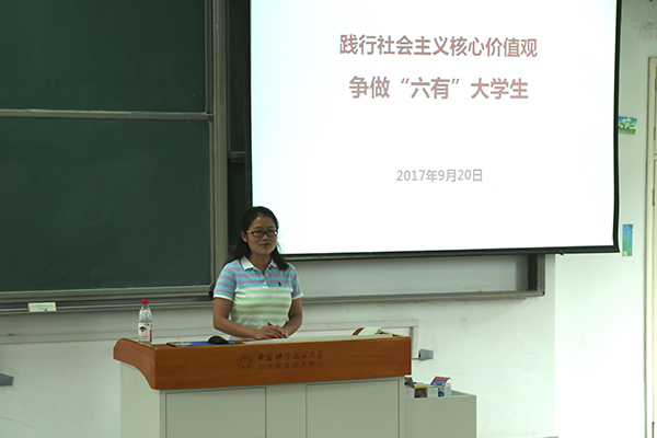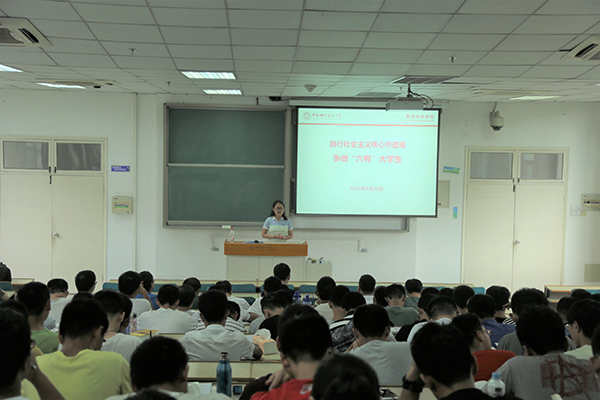 2017年9月20日下午4时在三教3C202教室,数学科学星空(中国)党委副书记杨晓果为2017级新生做了“践行社会主义核心价值观,争做“六有”大学生”的专题报告。2017级140多名本科新生参加了会议。
