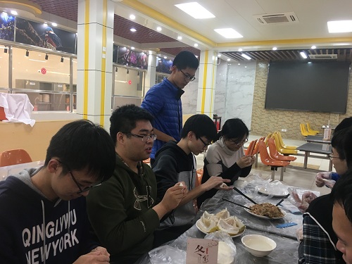 在所有饺子都包完后,食堂的工作人员帮我们把饺子加工,很快,热腾腾的饺子出锅了,大家瞬间一哄而上,一整锅饺子很快被一扫而光。虽然是大多数同学都不经常亲自下厨,但作为我们共同劳动的成果,不知为什么,我们都还觉得饺子格外美味。通过自己的劳动收获成果的美妙感觉,相信每一位同学都在这次活动中有所体会。在吃饺子的同时,大家还各自组织了有趣的小游戏,美食加上游戏所带来的欢乐,相信每个同学都乐在其中。
