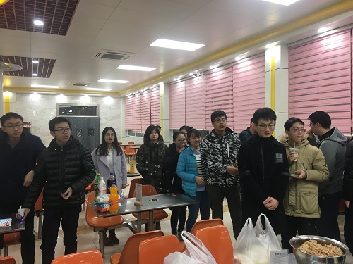 在筹备这次活动的过程中,团委同学首先去食堂预定了场地,然后在十二月三十日下午分成两组同学,一组去超市买馅料、水果以及饮料,另外一组同学去市场购买饺子皮。在下午六点左右,采购工作全部结束,此后团委同学先到食堂工作间内提前做好切菜,调馅等准备工作。在此时,其他同学也陆续来到了食堂,大家有的聚在食堂的一角,享用着盘里的水果,有说有笑;还有的进入工作间帮助团委同学做准备工作。