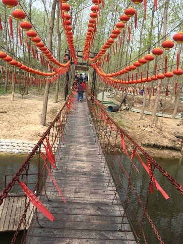 在牛家村,我们攀上塔楼,击鼓敲锣。经过吊桥,胆大的同学尽情地体验着与摇晃的桥面抗衡。平日生活与学习上的压力,此刻一扫而空。深邃的树林与别致的小景观,不仅洗肺,还能开心。