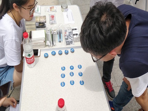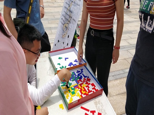 在前期海报和传单的号召下,同学们陆陆续续聚集到区桃李苑食堂广场,无论是孔明棋、行列式迷阵两个经典单人挑战项目,亦或是赌徒的算式、圈地为王、数学大乱斗等一类激烈的双人或多人对战游戏,都大受欢迎,现场一度人山人海。特别是圈地为王游戏,尤其受到大家的追捧。众人手持各形各色棋子,在角斗棋棋盘上圈地博弈,众人时而欢呼,时而惊叹,围观者甚众。