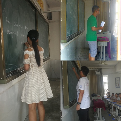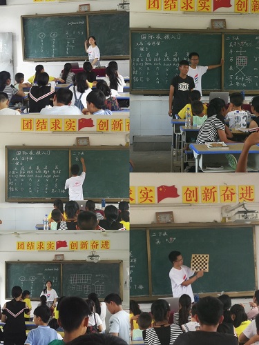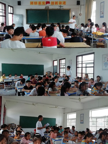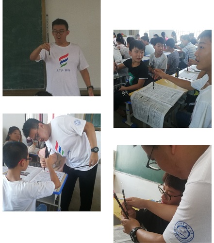 上课组的四位队员留在学校,分别负责一节课。今天为同学们带来的是英语课、书法课、历史课和趣味数学课。虽然夏天的空气里都弥漫着闷热的味道,但孩子们仍然在课堂里认真听讲,老师们也都尽自己所能的上好每一堂课。