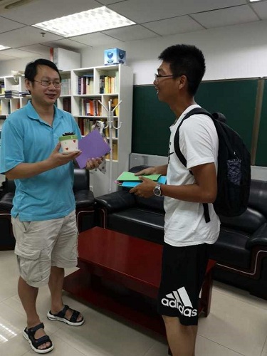 翌日,9月10日,于教师节当天刚下课,数院学生会的同学们已经等候在管研楼前,每人捧着精心准备的祝福,挨个访问各个办公室,给老师送上这份诚挚的问候与心意、感恩与温暖。在交谈与合照留影的过程中,老师们流露出欣慰的表情,同学们也更加懂得了教师节的意义。