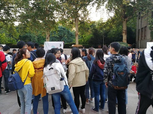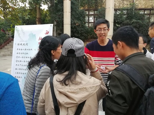 在筹备的同时,有很多慕名而来的同学们也早早的来到活动现场,在一旁围观,准备开始玩游戏和品尝美食。活动开始后,同学们纷纷走向自己感兴趣的摊位,从一开始的探头探脑,询问工作人员游戏玩法和供应食品,到后来的排起了长龙一般的队伍,翘首踮脚着期盼游戏快轮到自己。