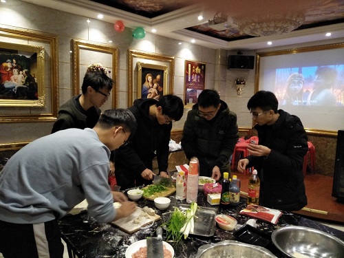 中午,大家就开始忙着准备午饭啦!班级团支书和副支书陈潇雅同学对各位同学的工作做了一些细致的划分,然后大家就开始忙活起来:和面、洗菜、剁肉、烧烤、生炉子煮火锅……过程中大家尽情聊天、欢笑连连,可以说是完全摆脱了最近各种ddl带来的压力。