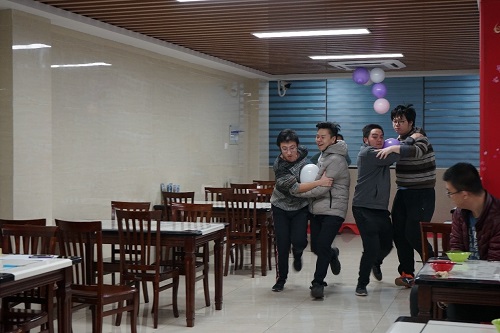 幸运的同学可以自由选择游戏,一是双人面对面或背对背夹气球运输,二是双人合作猜测词牌。赢了的同学可以领取奖品,输了的同学要在大家面前表演节目。活动开始时,饺子也出锅了,大家边吃饺子边看游戏表演,活动气氛达到了高潮。