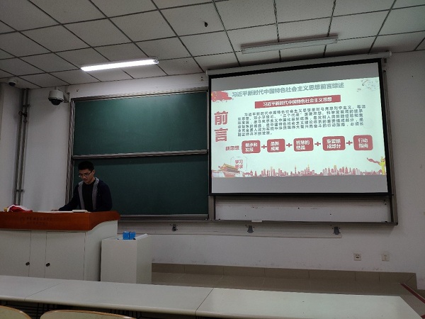 支部书记金灿同学从五个方面向大家宣讲了习近平新时代中国特色社会主义思想:“深入贯彻习近平新时代中国特色社会主义思想”、“习近平新时代中国特色社会主义思想的重大意义”、“习近平新时代中国特色社会主义思想的丰富内涵”、“习近平新时代中国特色社会主义思想的基本方略”、“新时代新思想的前进征程”。金灿同学的讲解十分慷慨激昂,在宣讲过程中同学们认真倾听,宣讲后大家的思想觉悟又提升到了一个新的境界。