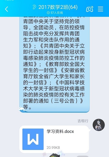 首先组织团员们系统学习了相关重要文件。团支书吉栩行同学收集整理了《共青团中央关于坚持党的领导,全团动员,在防控疫情阻击战中充分发挥共青团生力军和突击队作用的通知》;《共青团中央关于立即行动起来投身新型冠状病毒感染肺炎疫情防控工作的通知》;《教育部致全国大学生的一封信》《安徽省教育厅致全省广大学生和家长的一封信》;《中国科学技术大学关于新型冠状病毒感染的肺炎疫情防控有关工作部署的通知(三号公告)》等重要文件,并通过QQ群发送给全体团员认真学习。