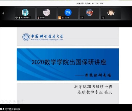 第二场是基础数学的吴天学长(科大保研)关于的成功保研经验的分享。学长先回答了一些同学比较关心的问题,然后从何谓保研出发,比较了其他单位的保研与科大数院保研的不同点,同时贴心地提出保研相关的注意事项,给大家提供了许多贴心的小建议。最后学长客观地提出保研、出国无高下之分,祝愿同学们可以选到自己心仪的学校。