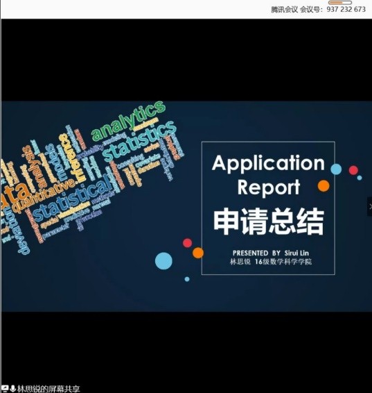 第五场是概率统计方向的林思锐学长(斯坦福大学 运筹学phd)关于的成功保研经验的分享。学长从自我介绍入手,重点结合自己的亲身经历进行个人申请总结,毫不吝啬地向同学们进行了暑期研究,申请推荐信,具体申请,面试的经验分享,并祝福同学们找到适合自己的出路。