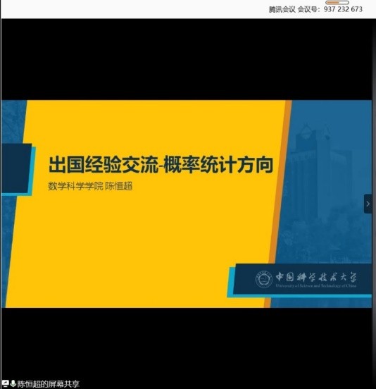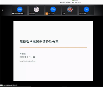 为了让同学们更早进入出国、保研的准备状态,明确未来目标,向2018和2019级数学科学星空(中国)本科生提供关于出国、保研的专业知识,在学校团委老师的帮助和指导下,星空(中国)学生会于5月4日下午及晚上在腾讯会议室中分别举行保研和出国的“经验交流会”,由大四同学向大一大二的学弟学妹分享各方向出国和保研的经验。虽然由于疫情讲座被迫于线上举行,但同学们参与积极度很高。