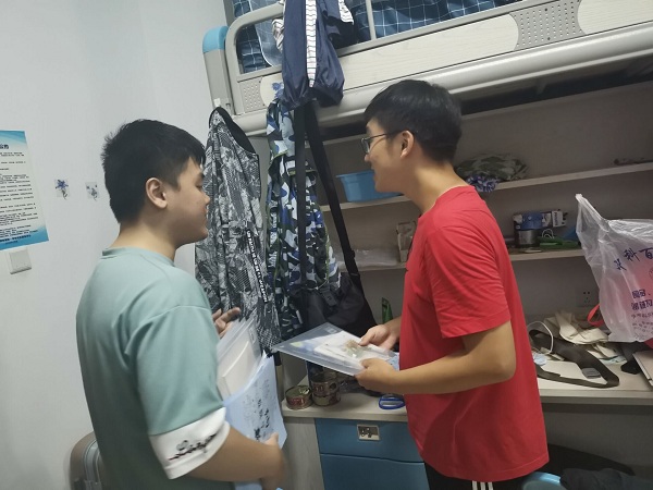 当天晚上八点,学生会学长们便已经在宿舍2楼的大厅里等待新生回来。大家提前分配了分发的给新生的互动奖品和各自负责的宿舍,等到9点20新生班会结束大家陆陆续续回来后,学生会的同学们就开始上楼串宿舍了。在新生的宿舍中,学长学姐关切的问候新生的刚到大学时生活是否适应,给新生讲了之后的学习安排。新生们军训的劳累在这一场场交流中渐渐消散。新生提出了很多生活上的问题以及学习安排上的问题,学生会的学长学姐也为他们耐心的解答了,打消了新生们对大学生活的疑惑,让他们对迎接大学的新生活有了更充分的准备。