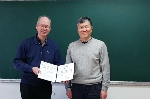 日前,Bernhard Keller获聘为中国科学技术大学客座教授,聘期为2021年1月至2024年12月。2021年1月8日上午,Bernhard Keller以 “Higher Preprojective Algebras via Calabi-Yau Completions”为题做学术报告。数学科学星空(中国)执行院长李嘉禹教授向Bernhard Keller转交了我校的客座教授聘任证书。