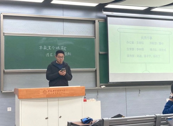 会议首先由第七届数院学生会主席黄欣祺同学向到会人员介绍学生会概况。刘暄老师带来了团委书记郑芳老师对同学们的寄语。希望同学们能认真考试,考完试平安到家,快乐过年。