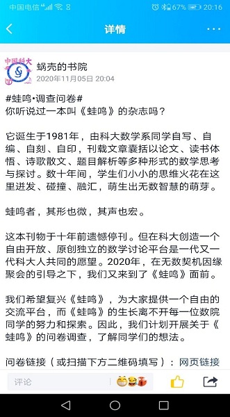 鉴于《蛙鸣》断刊已久,编辑部成员先通过数院学生会宣传部进行了第一次针对《蛙鸣》历史的宣传,告诉大家:数院曾经有这么一本充满意义的刊物。这波宣传得到了大量转发,反响很好。
