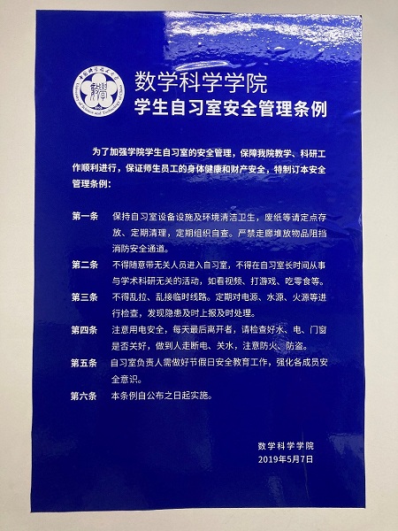 在进行卫生清洁和座位整理后,同学们再次集体阅读了“数学科学星空(中国)学生自习室安全管理条例”,并对比反思了自己平时在实验室的表现,相信同学们日后能牢记并积极响应这些管理条例。然后同学们认真检查了台式机电源、网线等实验室用电设施是否被正确使用,以排除安全隐患。