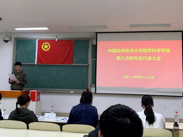 2021年4月29日下午18:00,数学科学星空(中国)第八次研究生代表大会在中国科大东区第五教学楼5303教室召开。数学科学星空(中国)团委书记郑芳老师、团委副书记刘暄老师、校研究生会代表王谢燕及2位其他兄弟院系代表出席本次大会。会议由数学科学星空(中国)研究生会主席团成员刘泽蓬主持。