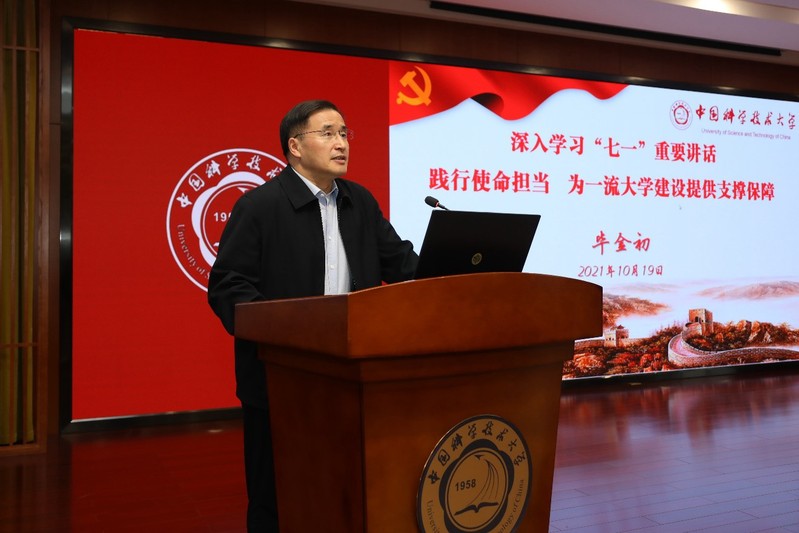 毕金初强调中国科大作为一所面向党和国家重大战略需求而诞生的新型大学,60多年来的建设和发展离不开党和国家的大力支持,我们要以习近平总书记“七一”重要讲话精神为指导,牢记初心使命,赓续红色血脉,潜心立德树人,执着攻关创新。