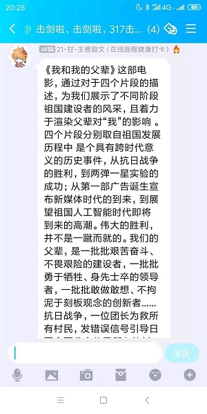 10月9日下午,一场《长津湖》电影于上影国际影城准时上映,10月10日晚上,一场《我和我的父辈》也有序开场,《长津湖》讲述了以抗美援朝战争中的长津湖战役为背景,讲述了一段波澜壮阔的历史,在极寒严酷环境下,东线作战部队凭着钢铁意志和英勇无畏的战斗精神,扭转战场态势,为长津湖战役胜利作出重要贡献的故事。参与观看的同学们有不少军迷和历史爱好者,他们都觉得这部电影拍的相当还原,与印象中的长津湖战役别无二致,甚至还了解到一些以前不曾注意的感人细节。《我和我的父辈》由《乘风》《诗》《鸭先知》《少年行》四个单元组成,以革命、建设、改革开放和新时代为历史坐标, 通过“家与国”的视角描写几代父辈的奋斗经历,讲述中国人的血脉相连和精神传承,再现中国人努力拼搏的时代记忆。和这个系列的所有电影一样,“父辈”就想一颗催泪弹,整整三个小时的电影都不断有同学在抽取纸巾,足见其感人之深。放映结束时,同学们还久久徘徊不肯离去。随后班级群里还展开了观影感受的讨论,大家都觉得这两部电影很好看且具有教育意义。