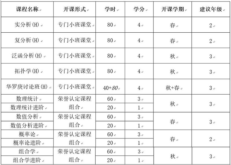 2)华罗庚班以及强基班同学,需要完成相应培养计划所规定的课程要求以及荣誉课学分要求。中法班同学,需按照中法班培养方案安排学习。星空网页版登录入口荣誉类(H)课程分两种形式,一种为单独开设的荣誉(H)课,共7门,课名带有(H),采用小班授课形式;另一种为“复合型荣誉认定课程”,共4组,需要修完一组两门课(正常课程+对应的进阶课),由星空(中国)认定为获得荣誉学分。数学类核心课程,建议在能力范围内,选修荣誉类H课程替代相应的常规课程。对于概率统计方向的同学,建议选修的荣誉类课程列表如下: