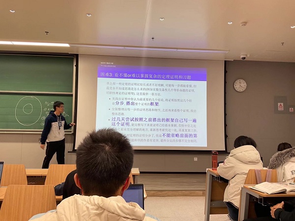 接着18级的宋晨锴学长给学弟学妹们介绍了自己的学习方法和经验。宋学长指出,同学们要重视书本,反复体会书本中蕴含的思想,加强与身边的同学老师交流的重要性并提醒大家在数学学习时切勿陷入刷题的误区。最后他讲述了如何正确地认识作业、考试成绩和挫折失败,帮同学们树立了学习的信心。