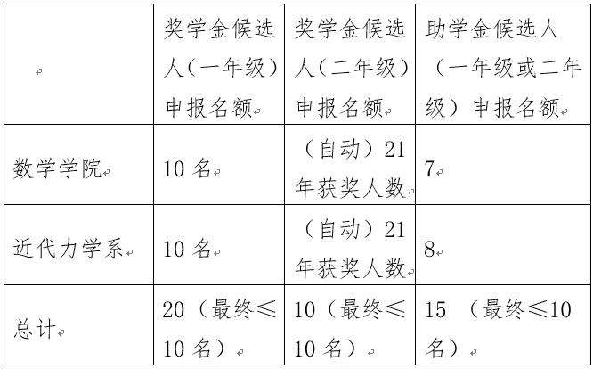 2022年度我校共有“蒋震奖学金”最终名额20名,“蒋震助学金”最终名额10人,由蒋震工业慈善基金会根据我校提供的候选人名单进行差额评选,候选人名额分别为30人和15人。除奖学金候选人(二年级)是因去年获评自动取得申报资格外,其他奖项均需组织研究生申报,名额分配如下: