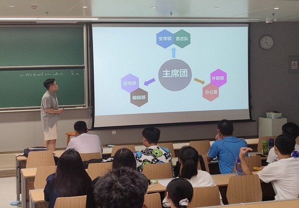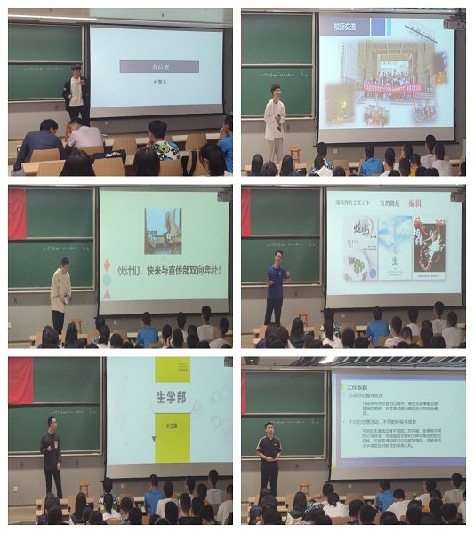 随后由各部门的部长介绍相关部门的详细情况。一共有六位部长上台发言。办公室部长何擎天介绍了本部门的工作及项目组相关的工作。外联部部长黄帅介绍了内联活动、校际交流和赞助商的相关安排。宣传部部长朱葛瑄介绍了公众号运营和活动的相关图片设计等内容。编辑部部长计科羽介绍了由他们所编辑的院刊《蛙鸣》、《薪火相传》和《青空》,生学部部长叶王潇介绍了笔记网站的运营,图书小站的值班以及一些讲座的举办工作。青志队部长孙卓文介绍了他们众多的志愿活动,如四点半课堂、科技馆讲解和校园马拉松志愿服务。在他们细致的PPT和生动幽默的发言中,新生们对数学科学星空(中国)学生会各部门有了更深入的了解。之后董申向大家讲述了他与数院学生会的不解之缘,同学们听后十分的感动。