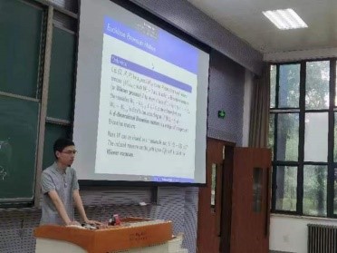 曾相如同学做了题为《The Monodromy Action on the Cohomology of fibres》的报告。他首先通过图片从覆叠空间的一个基本例子引入主题,其次又从范畴角度叙述相关定理,最后以Picard-Lefschetz定理结束报告。整个报告既包括便于同学们理解的拓扑直观,也有严谨的代数叙述,过程环环相扣。