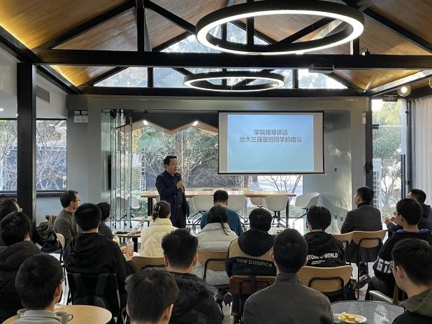 黄文老师随后发言,他表示同学们在近几年的的努力下取得了令人满意的的成绩,希望大家在遇到困难或需要帮助时可以及时反馈,希望这个活动能帮助同学们对未来有一个清晰的规划,在研究生或者以后的人生阶段学有所成,选择适合自己的专业领域。