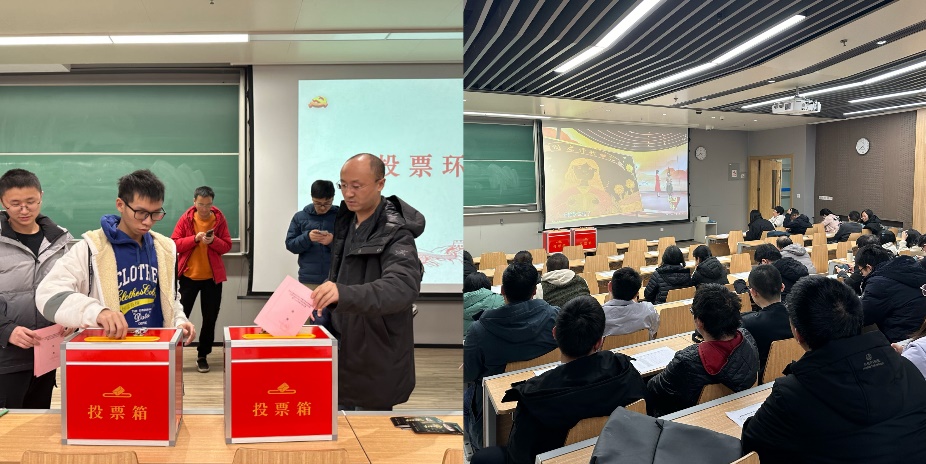 大会选举阶段,监票人当众检查票箱,计票人在监票人监督下向与会人员分发选票。在投票结束后,总监票人、监票人、总计票人、计票人当众打开票箱,清点票数并进行计票工作。计票期间,全院师生党员认真观看学习《榜样8》。