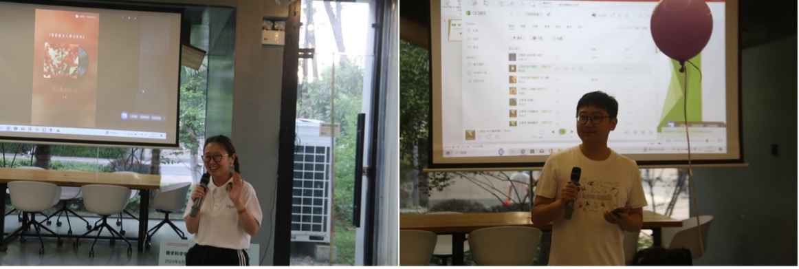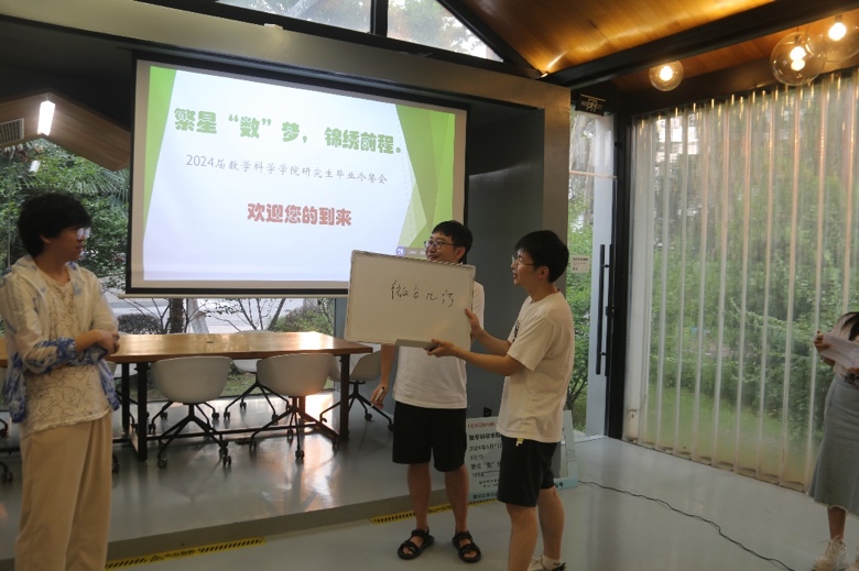 本次活动的第一个游戏环节是猜数学名词,主持人邀请了几位热爱数学的同学上台,互相猜对方写的数学名词,见到熟悉的一个个概念被写在白板上,台上台下的同学们都回忆起了这些年在科大刻苦学习、做科研的生活。