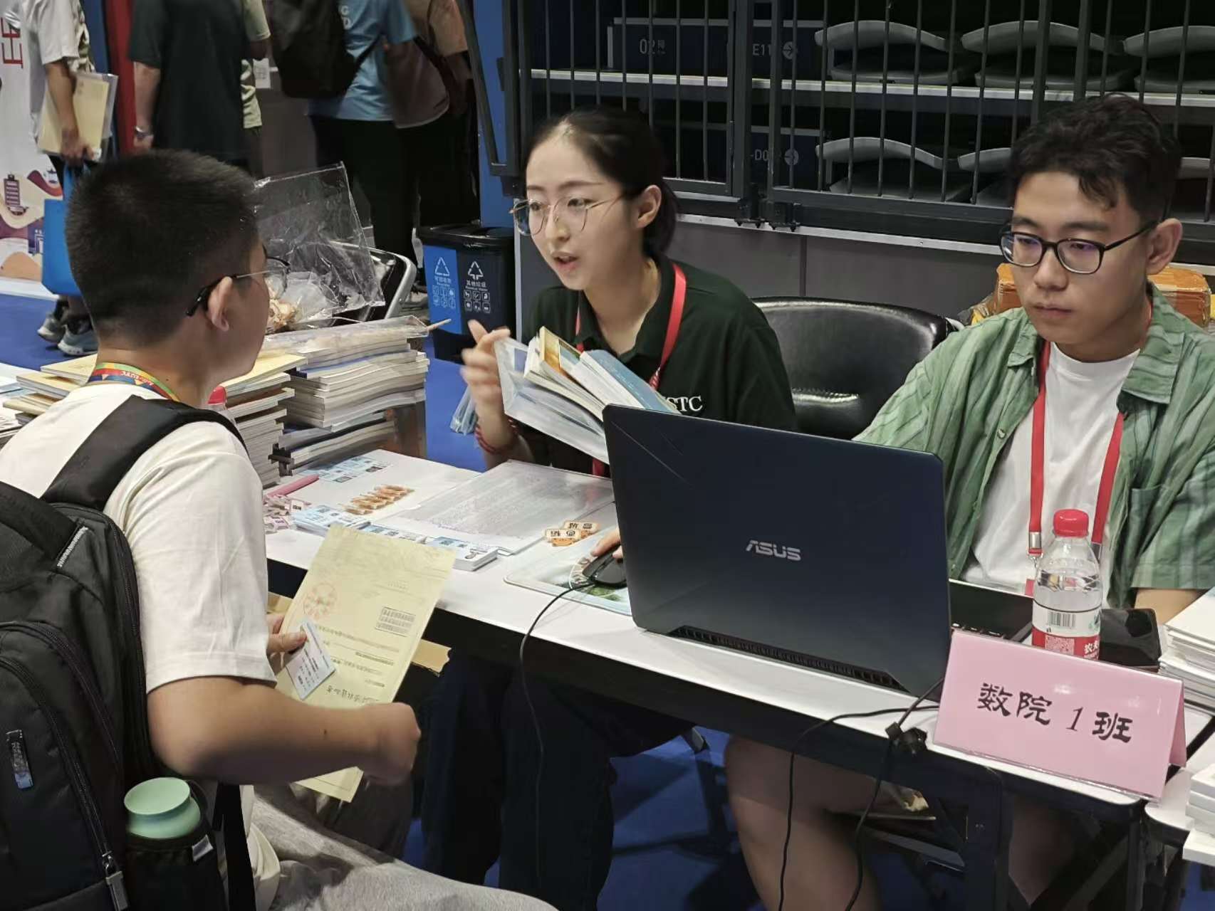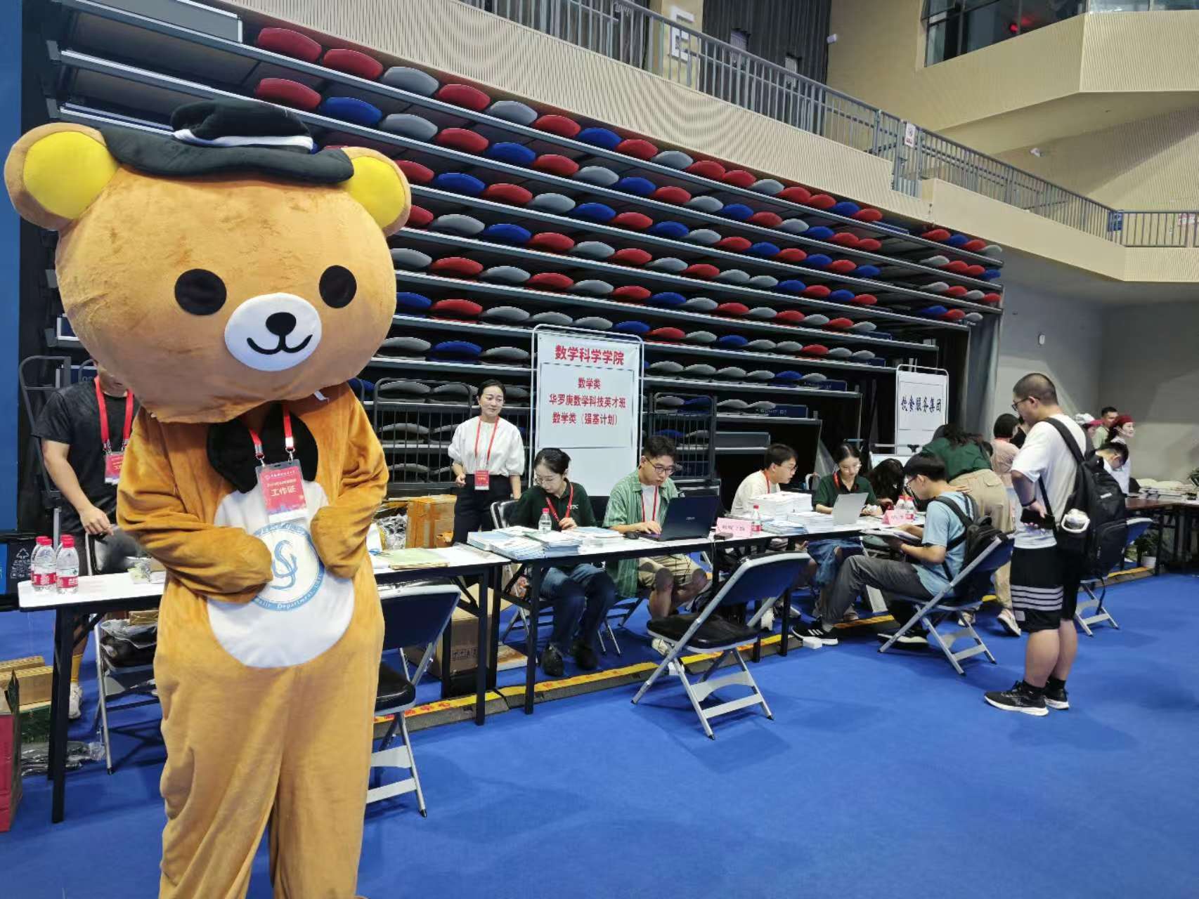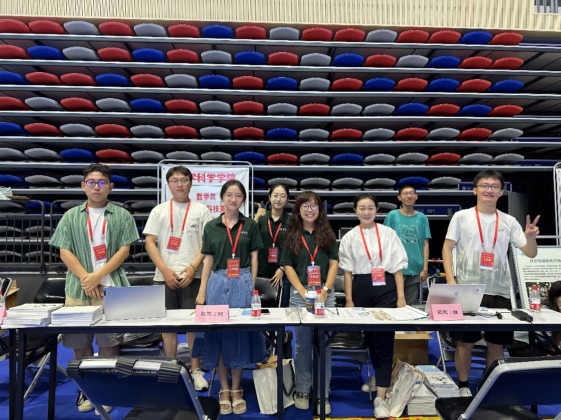 2024年8月23日,中国科学技术大学迎来了2024级本科新生。上午八点半之前,数学科学星空(中国)全体迎新老师及学生志愿者已在中区体育馆做好迎新准备,九点正式开始报到工作。现场的班主任、班助以及志愿者同学们认真负责的介绍流程和统计信息,新生们完成了信息核对,领取了报到材料,同时也拿到了由数院准备的小腰包和风扇,以及由数院学生会准备的两本院刊:《蛙鸣》和《薪火相传》。