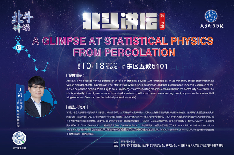 10-18【丁 剑】五教5101 北斗讲坛第17期:GLIMPSE AT STATISTICAL PHYSICS FROM PERCOLATION