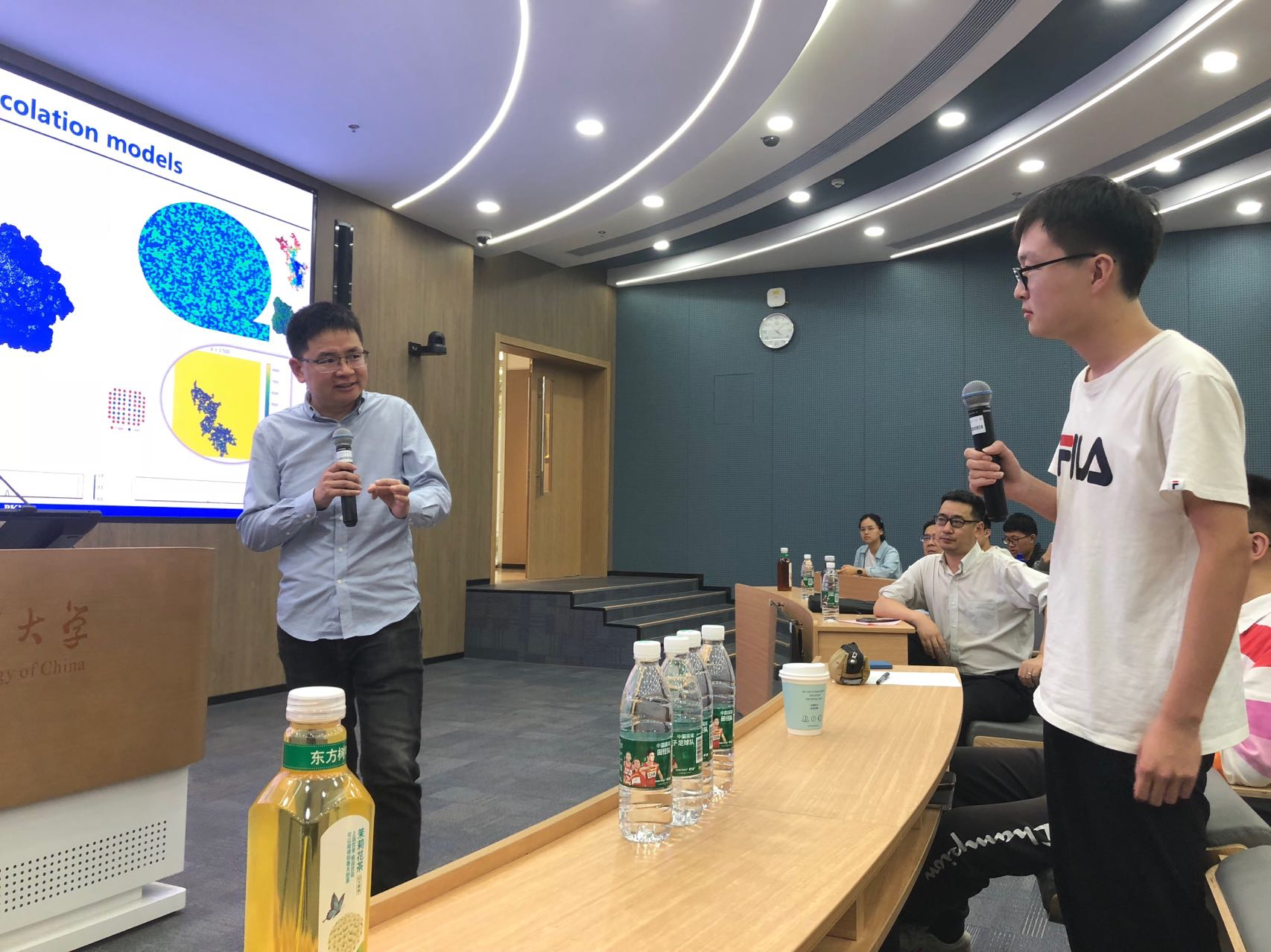 还未开场,丁教授展示的加热磁铁和渗流模拟就吸引了观众们。丁教授从最浅显易懂的二维平面伯努利模型出发,解释了什么是渗流模型以及其相变。相变点附近的神奇现象和对相变点位置的分析让现场的同学们大开眼界。