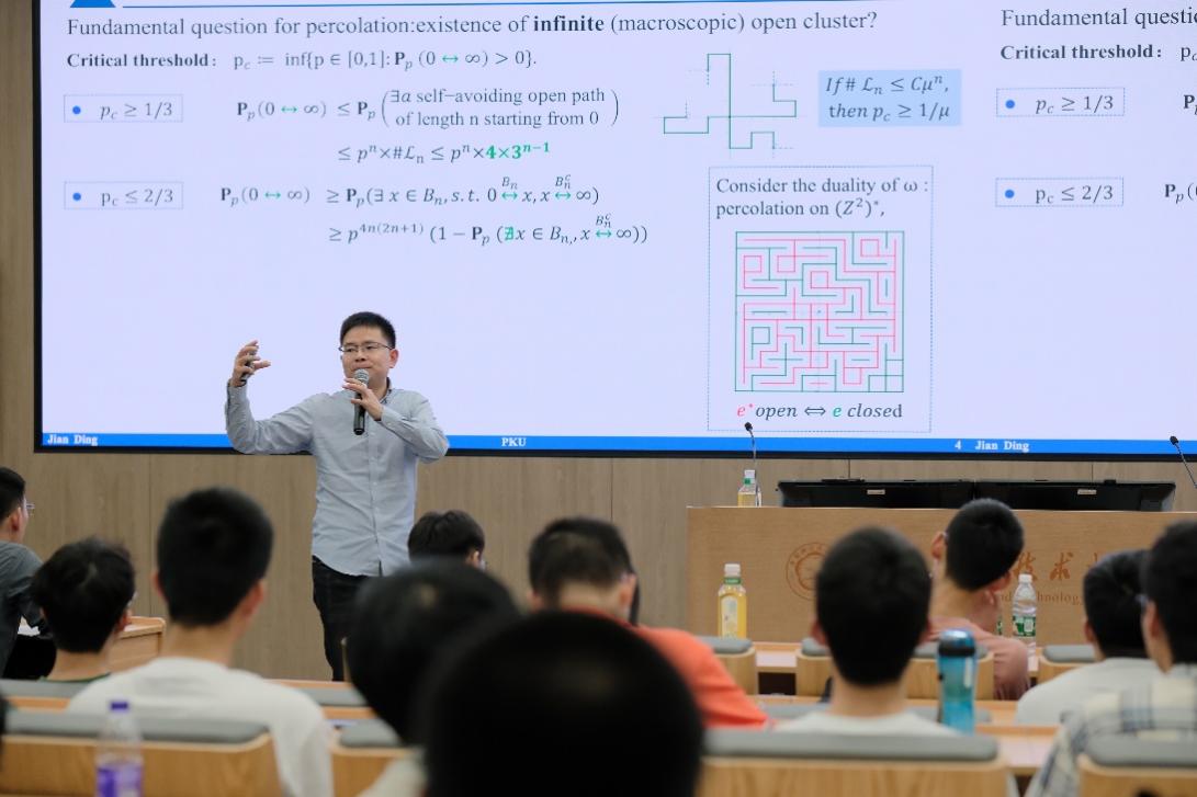 随后,丁教授由“水能否到”引入“水何时到”,为我们介绍了模型当中随机度量球的尺度极限,以及长程渗流模型中的随机游走等问题。丁老师对这些问题的讲述循序渐进,引发了同学们的深思。