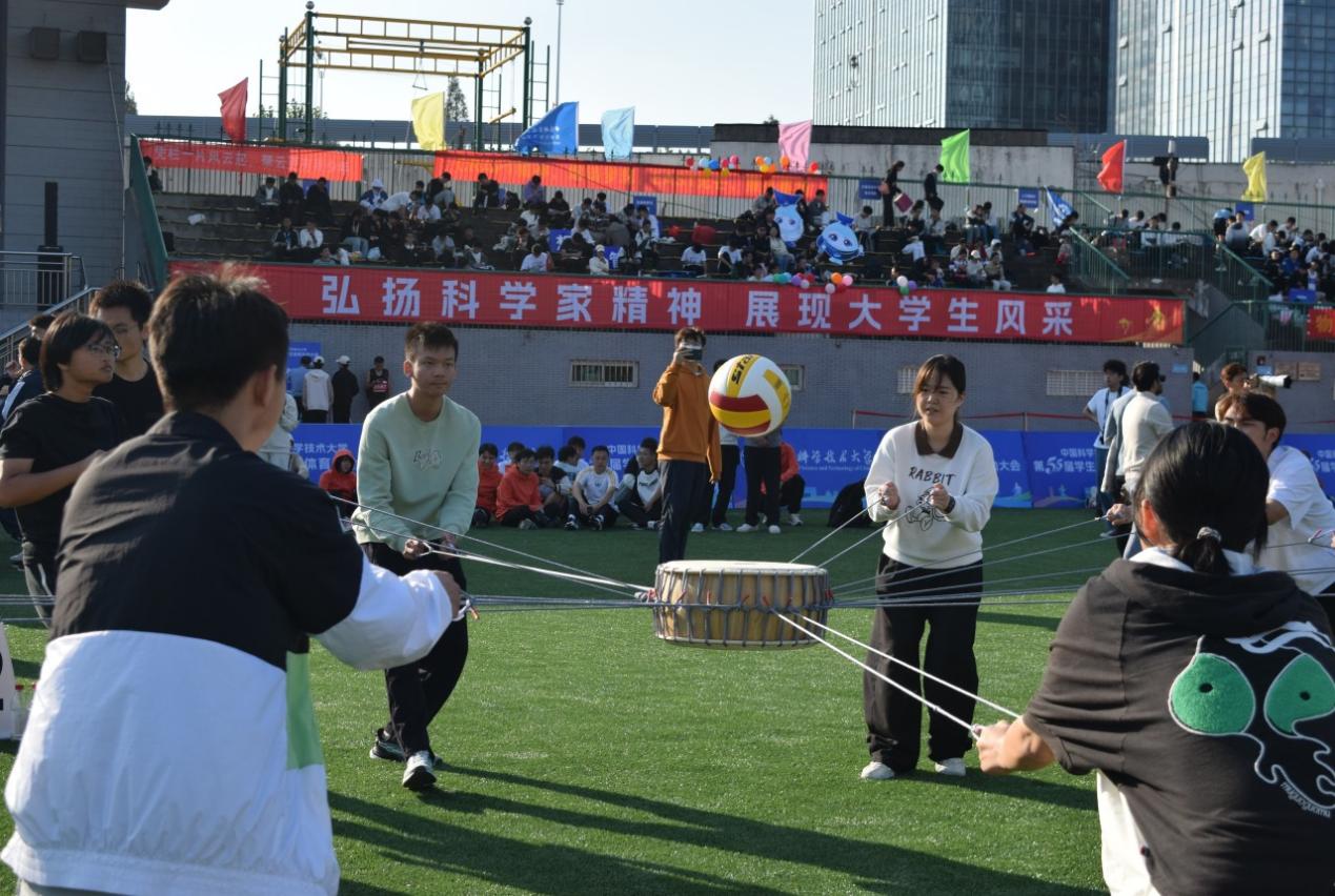 趣味项目热闹非凡。在“击鼓颠球”项目中,选手们围成一圈,紧握鼓绳末端的手柄,齐心协力将排球颠出鼓面。在两分钟内,数院选手们通过完美的节奏与配合成功保持了球的稳定,最终以最多的颠球次数夺得金牌。