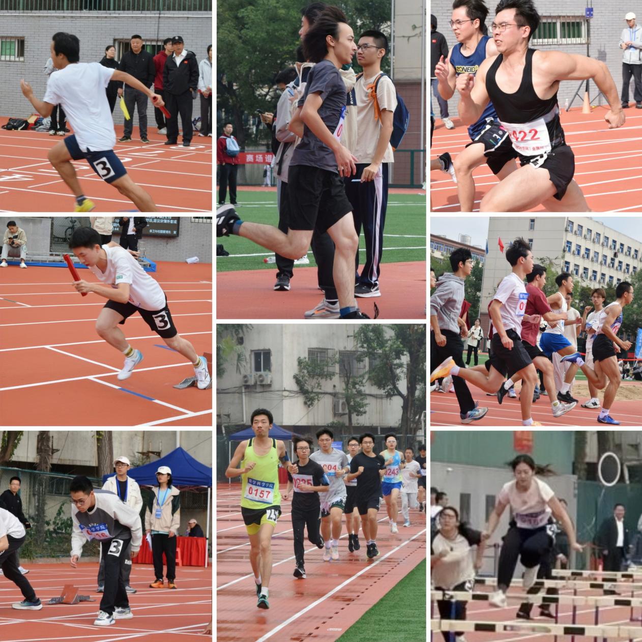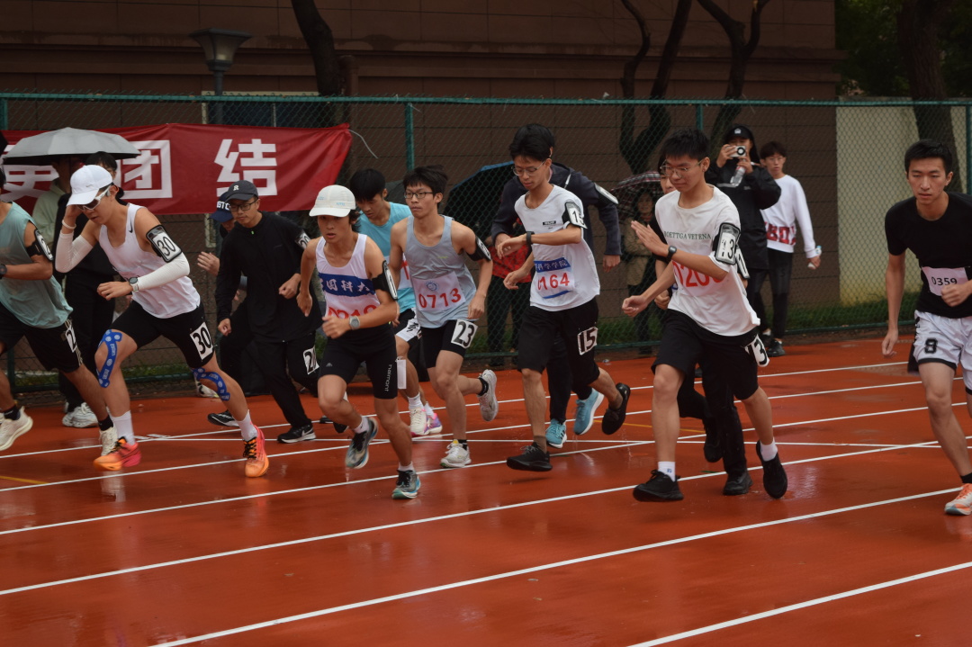 径赛项目角逐激烈。100米短跑选手如离弦之箭,枪声一响便全速向前,朝着终点奋力冲刺;800米跑步选手尽情奔跑,咬牙坚持,拼尽全力;数院女子跨栏选手们巾帼不让须眉,勇敢超越自我,最终斩获银牌;接力赛选手们冷静专注,凭借耐力和毅力征服赛道的每一个转角;3000米长跑选手们步伐坚定,即便突如其来的雨水洒落在绿茵场上,但选手们的激情丝毫未减,他们在雨中奋力奔跑的身影,成为赛场上最动人的风景线。