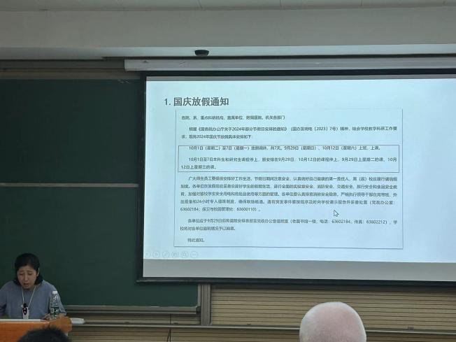 接下来,班会进入第一个环节:假期安排和假期安全。段老师围绕即将到来的国庆假期,详细讲解了出行安全注意事项,并且提醒假期离校的同学们要记得在学校系统上申请报备离校。随后,徐班助针对近期频发的地震灾害,组织大家观看了地震相关的科普视频,告知大家地震发生时应采取的紧急避险措施,提醒大家保持警惕,掌握必要的自救互救技能。